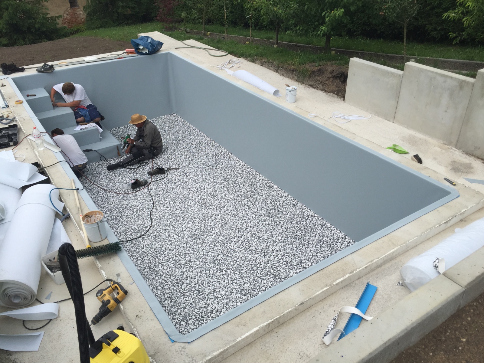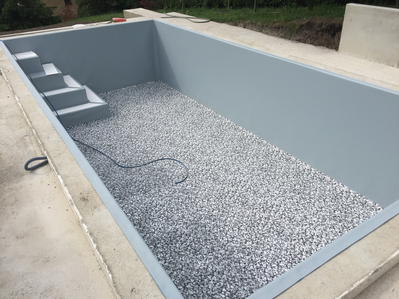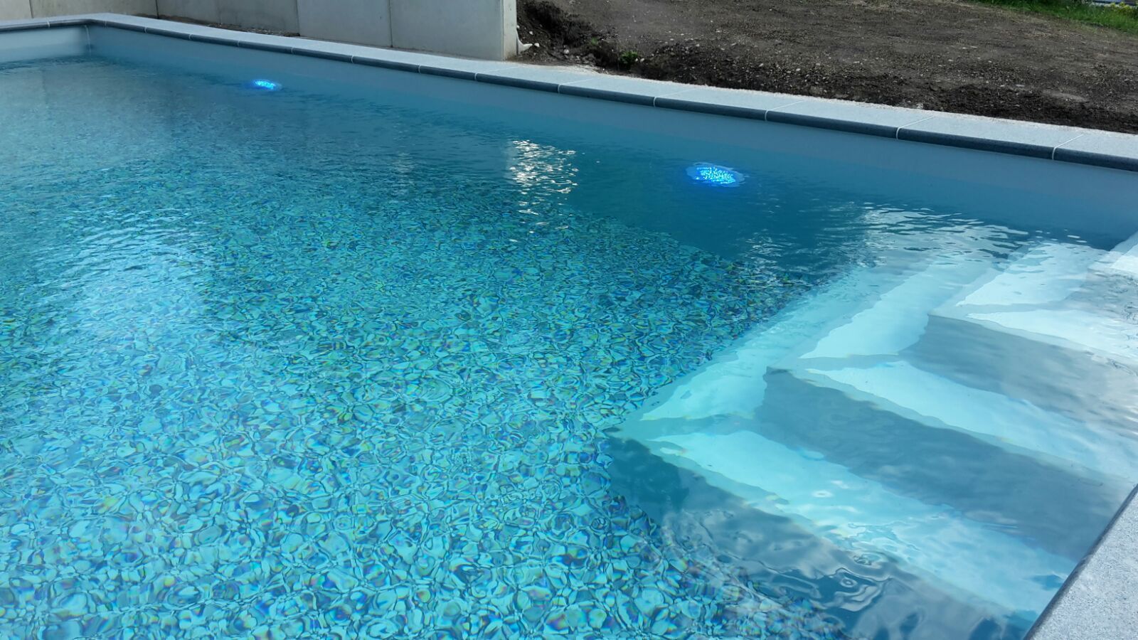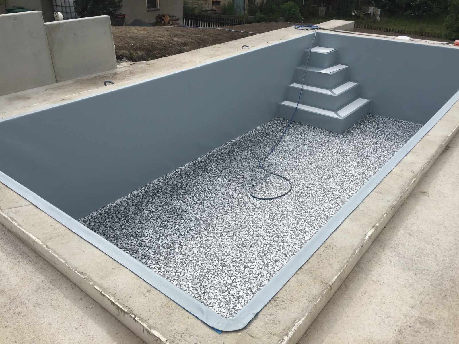 Die abschließenden Arbeiten lagen danach wieder in den Händen des Poolbauers. Trotz schlechter Wetteraussichten wurde die komplette Folien innerhalb eines Tages verlegt.