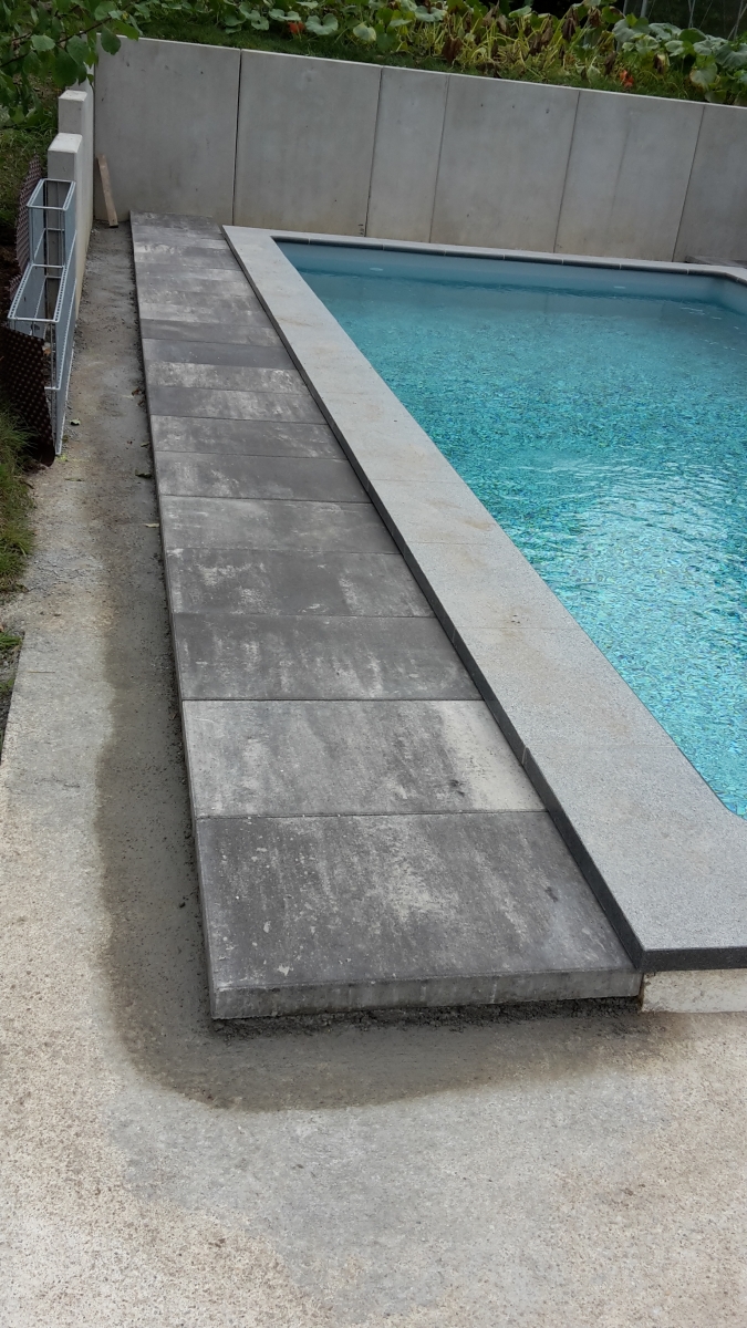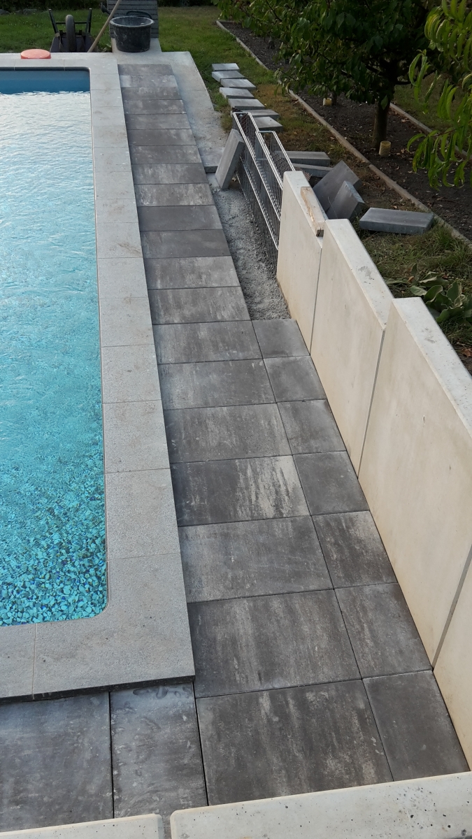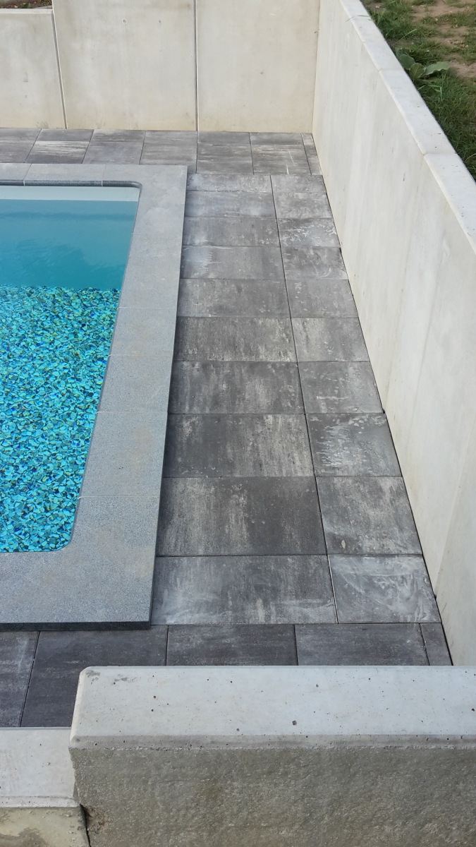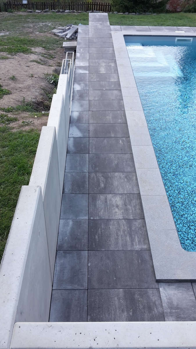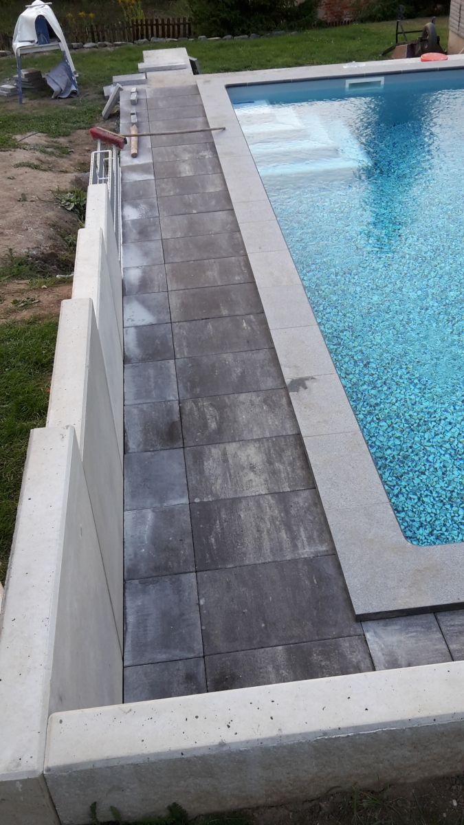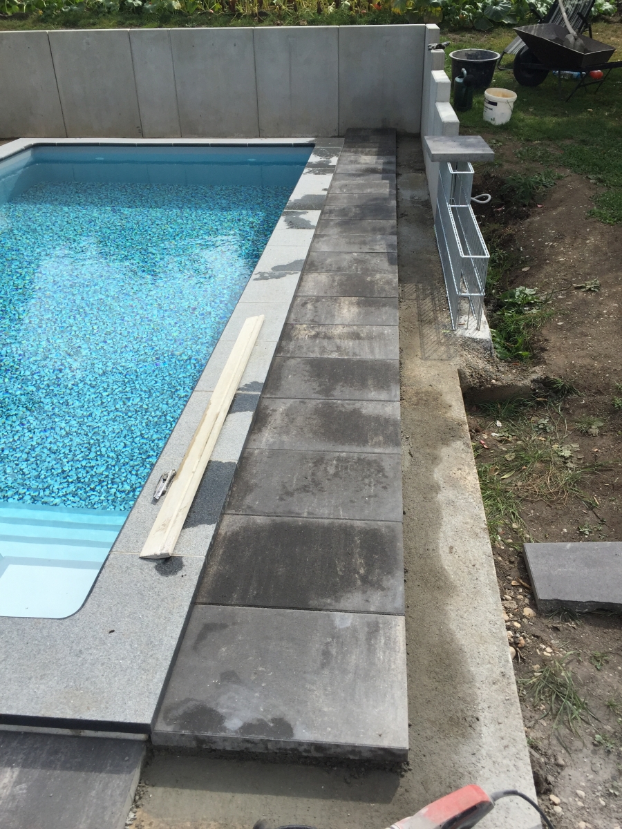 Abschließend wurden noch die Außenanlagen gestaltet. Dazu gehört unter anderem das Verlegen von Terrassenplatten auf der Umrandung des Pools, aber auch das anfüllen mit Mutterboden um den Garten wieder entsprechend anzugleichen.