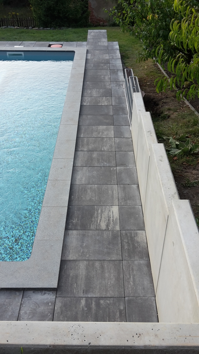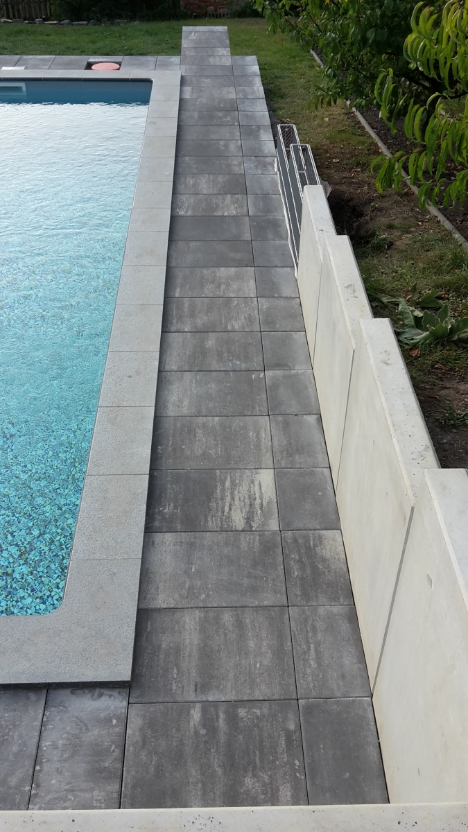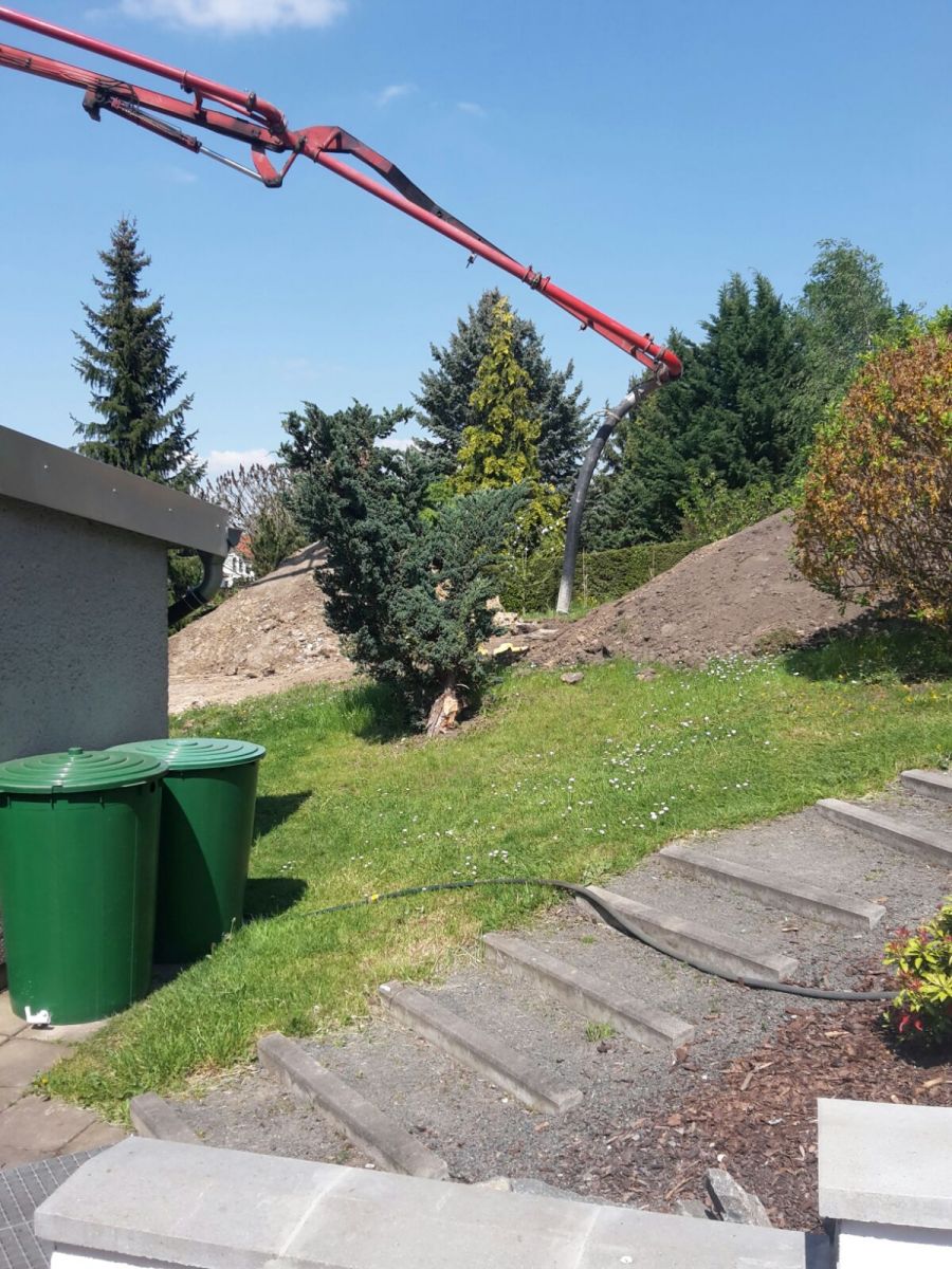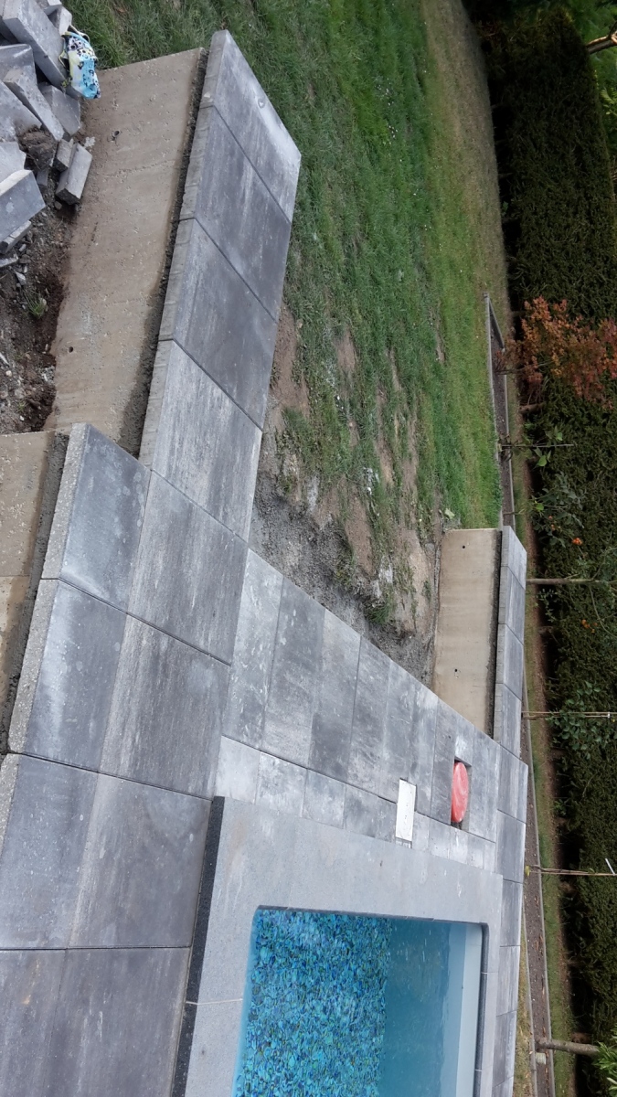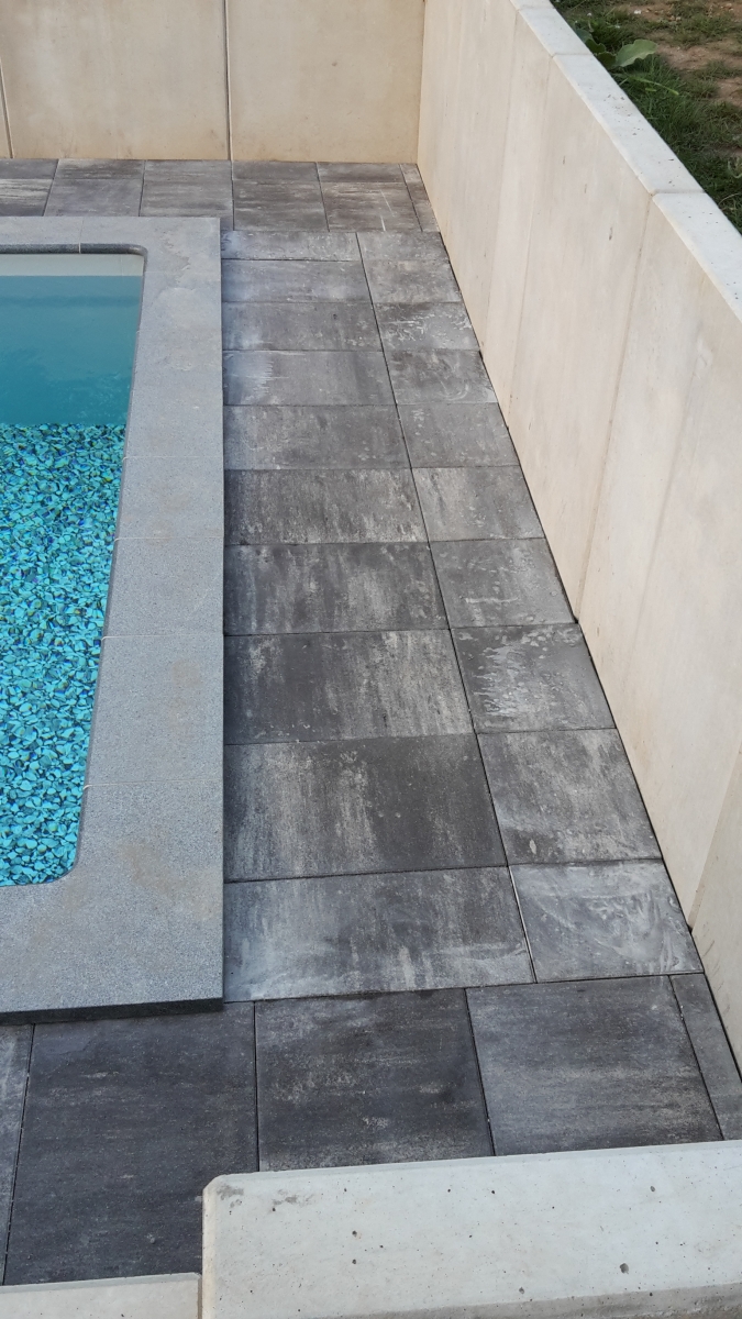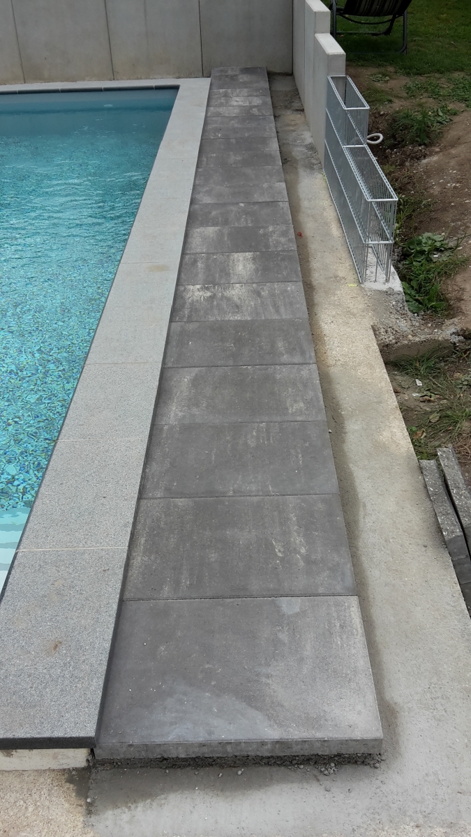 Abschließend wurden noch die Außenanlagen gestaltet. Dazu gehört unter anderem das Verlegen von Terrassenplatten auf der Umrandung des Pools, aber auch das anfüllen mit Mutterboden um den Garten wieder entsprechend anzugleichen.