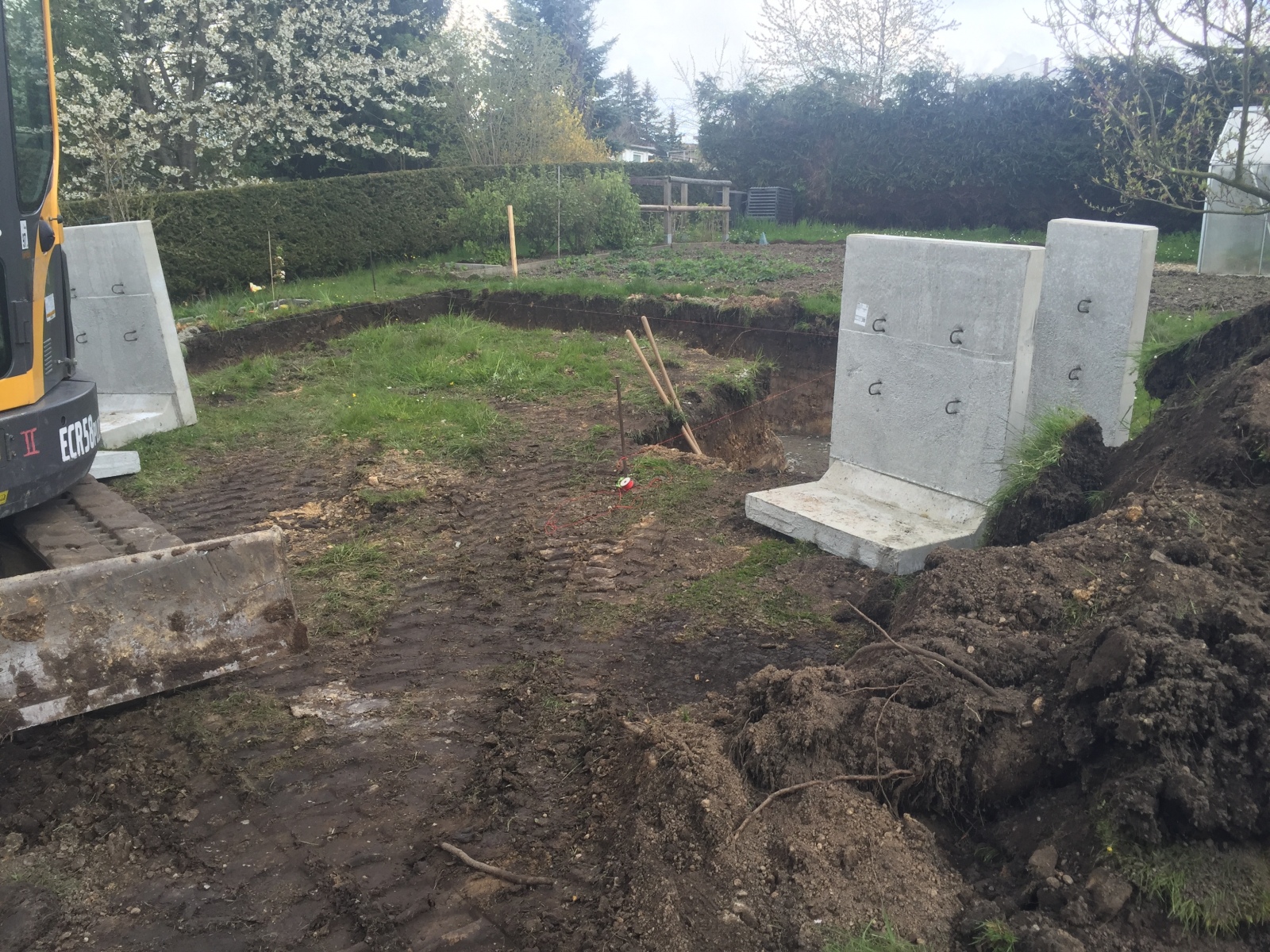 Da unser Grundstück recht abschüssig ist, wird der Pool am Ende auf der einen Seite gut 1,20m in den Boden eingelassen. Auf der anderen Seite stehen die Fundamente für die Überdachung knappe 0,60m oberhalb des Rasens.
