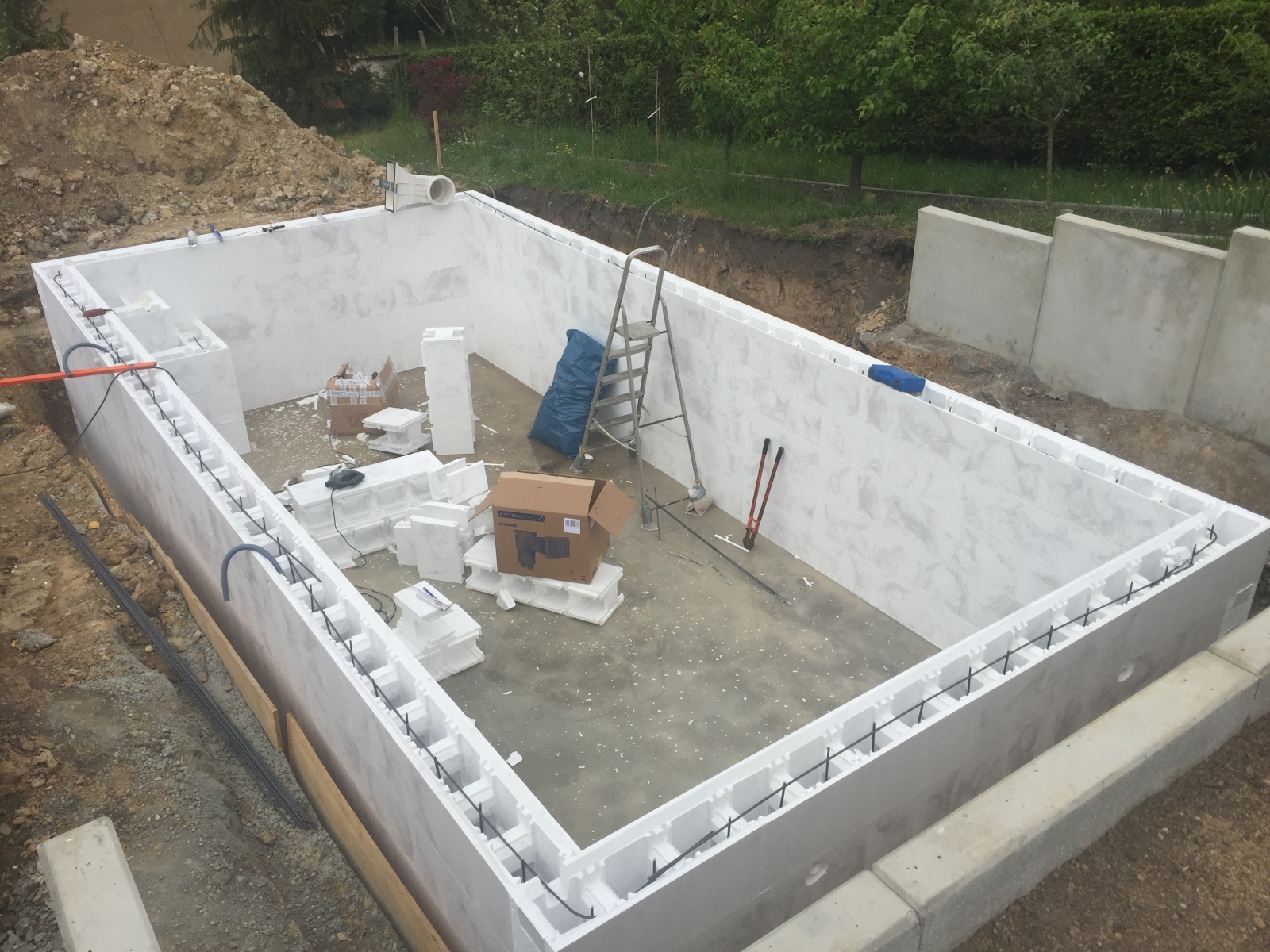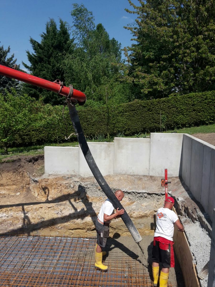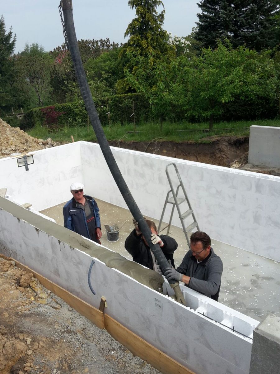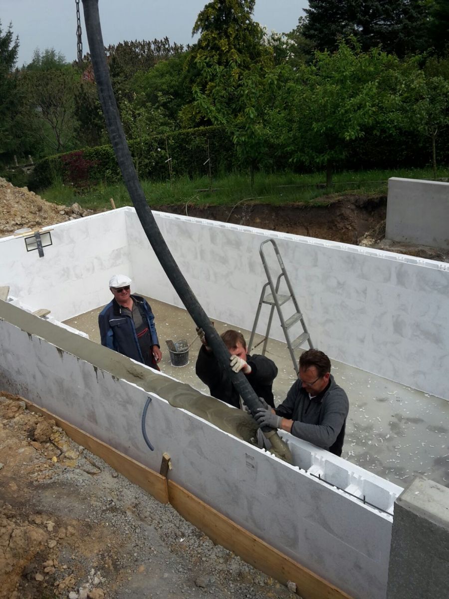 Danach wurde eine Schalung für die Poolumrandung aufgebaut und mit knapp 20m³ Beton verfüllt. Dabei wurde auch gleich die entsprechenden Fundamente für eine spätere Überdachung mit gegossen.